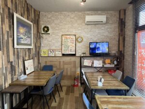 テーブル席が中心で、明るすぎず落ち着きすぎない、ちょうど良い居心地です。